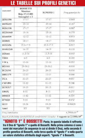Il settimanale Giallo pubblica la tabella comparativa tra il corredo genetico del muratore e quello di "Ignoto 1", come è stato chiamato il killer
